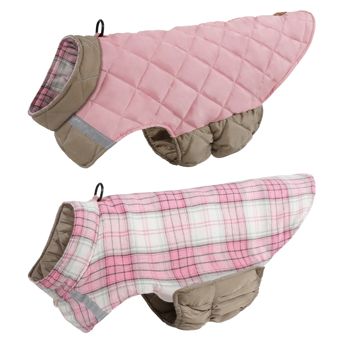 Double‑sided design (plaid and solid colors) for versatility; reflective piping enhances visibility.